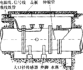 由于大口徑管道在多數(shù)場合下是埋在地下的,因此大口徑傳感器在安裝前應(yīng)做好水泥地坑。圖6-19所示是在給排水系統(tǒng)中常見的安裝形式。水泥地坑應(yīng)有足夠的活動空間,側(cè)壁埋有敷設(shè)電纜的鋼管,上有蓋板防止雨淋,下有泄水管以免坑內(nèi)積水而使傳感器侵水。為了拆裝方便,傳感器應(yīng)放在墊腳上,且在下游側(cè)裝有活絡(luò)的伸縮管。圖6-20是電磁流量計在地下水泥管污水排放系統(tǒng)中的安裝實(shí)例。
