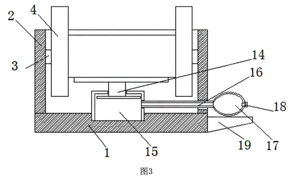 本發(fā)明的電磁流量計(jì)傳感器模具,包括模具底座1,模具底座1的頂面固定連接有模具擋板2,模具擋板2的表面固定連接有模具連接桿3,模具連接桿3遠(yuǎn)離模具擋板2的一端固定連接有調(diào)節(jié)模具4,模具擋板2的表面開設(shè)有升降活動(dòng)槽5,升降活動(dòng)槽5的內(nèi)壁滑動(dòng)連接有升降滑塊6,升降滑塊6的表面固定連接有升降板7,升降板7的表面開設(shè)有調(diào)節(jié)活動(dòng)槽8,調(diào)節(jié)活動(dòng)槽8的內(nèi)壁活動(dòng)連接有調(diào)節(jié)滑塊9,調(diào)節(jié)滑塊9的表面固定連接有調(diào)節(jié)桿10,調(diào)節(jié)桿10遠(yuǎn)離調(diào)節(jié)滑塊9的一端貫穿調(diào)節(jié)活動(dòng)槽8的內(nèi)壁并延伸至升降板7的外部,升降板7的內(nèi)部開設(shè)有與調(diào)節(jié)桿10相配適的滑槽,調(diào)節(jié)桿10的一端螺紋連接有固定蓋11,調(diào)節(jié)滑塊9的頂面固定連接有定位滑軌12,通過調(diào)節(jié)模具4與定位滑軌12,使得在組裝模具時(shí),能夠通過焊機(jī)的定位裝置在定位滑軌12上滑動(dòng),從而能夠直接將需要焊接的焊釘焊接到需要組裝的電磁流量計(jì)傳感器上,不需人工手動(dòng)定位,避免手動(dòng)焊接造成的誤差,從而避免了產(chǎn)品組裝時(shí)的不可控性,達(dá)到了提高車間生產(chǎn)效率的效果,升降板7的底面固定連接有升降連接架13,升降連接架13的底面固定連接有升降活塞14,升降活塞14的表面套接有升降套管15,升降套管15的底端與模具底座1的頂面固定連接,模具底座1的頂面開設(shè)有與升降套管15相配適的凹槽,升降套管15的表面連通有導(dǎo)氣管16,導(dǎo)氣管16遠(yuǎn)離升降套管15的一端貫穿模具擋板2的表面并延伸至模具擋板2的外部并連通有氣囊17,氣囊17的表面設(shè)置有氣門芯18,氣囊17的底面活動(dòng)連接有氣囊托板19,氣囊托板19的表面與模具底座1的表面固定連接,氣囊17與調(diào)節(jié)桿10,在需要安裝不同的零件時(shí),通過觀察定位滑軌12與調(diào)節(jié)模具4的相對(duì)位置調(diào)節(jié)定位滑軌12的高度和在升降板7上的位置,來配合不同零件的安裝位置,從而達(dá)到了方便傳感器組裝的效果。