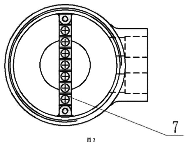 本實施例如圖4所示,分體接線盒用4只M6的螺釘8將売體3與固定在流量傳感器7上端,殼體3與傳感器7之間采用橡膠密封墊9密封。端子排7用兩個M4的螺釘固定在売體內,接線端子通過連接電纜5,穿過安裝在殼體上的格蘭頭6連接到變送器。分體蓋1通過螺紋擰緊在殼體3的上端,分體蓋1與売體3的密封采用0型圏密封。使用時電纜5與管道軸線方向一致,管道為垂直方向時,電纜出線方向朝下,從而不會造成外部的液體流入殼內。