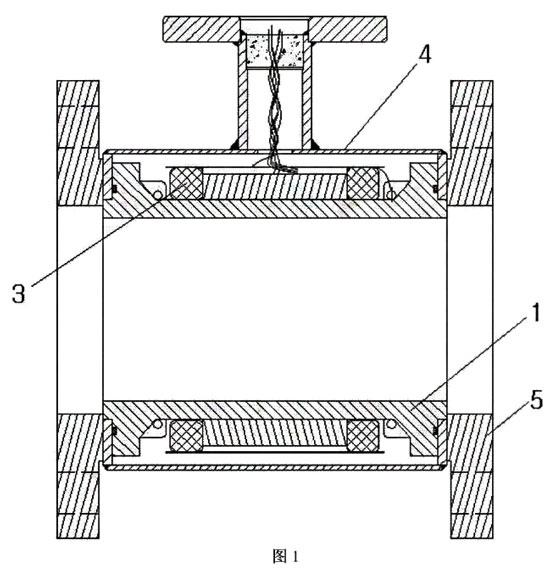 所述導(dǎo)流管1上固定有一全封閉的密封罩4,其兩端各設(shè)有一電磁配對法蘭5,其管壁上設(shè)有兩個貫通其管壁的測量孔,每個測量孔對應(yīng)一個測量電極2,每個測量電極2的一端插入其對應(yīng)測量孔中,每個測量電極2的外周面與對應(yīng)測量孔的孔壁之間均用絕緣隔套隔離并密封,各測量電極2及各勵磁線圈3均罩設(shè)在密封罩4內(nèi),并各經(jīng)導(dǎo)線引出密封罩4;其特征在于:所述導(dǎo)流管1是一塑膠絕緣管體。