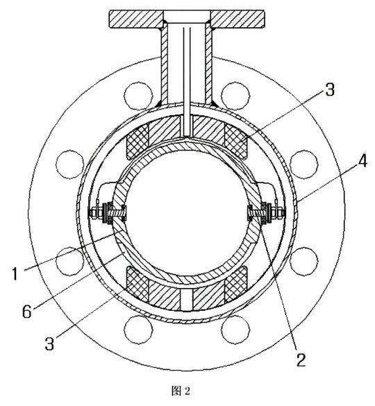 以下結(jié)合附圖說明對本發(fā)明的實施例作進一步詳細描述,但本實施例并不用于限制本發(fā)明,凡是采用本發(fā)明的相似結(jié)構(gòu)及其相似變化,均應(yīng)列入本發(fā)明的保護范圍。如圖1-圖2所示,本發(fā)明實施例所提供的一種電磁流量計的無樹里測量頭,包括導(dǎo)流管1、測量電極2和勵磁線圏3,所述測量電極2和勵磁線圈3各有兩個,沿導(dǎo)流管1的周向軸對稱交替固定在導(dǎo)流管管壁上;