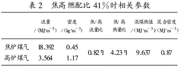 實際生產上采用的焦爐、高爐煤氣的配比為百分之四十一左右,有時甚至更低。現以配比為百分之四十一為例,相關參數如表2。