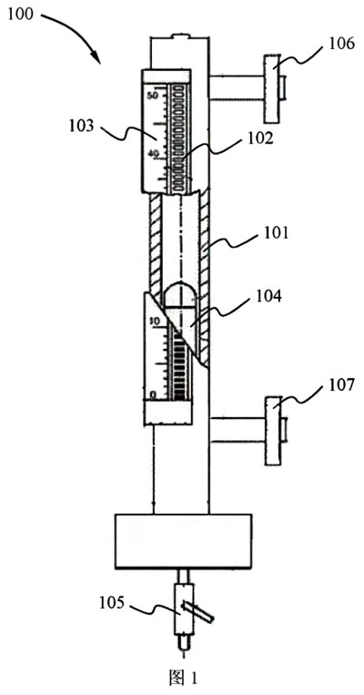如圖1所示,本實(shí)用新型的保溫型塑料磁翻板液位計(jì)100主要包括:液位計(jì)主體101、翻板指示器102、標(biāo)尺103、磁浮子104。其中,液位計(jì)主體101的內(nèi)部具有一中空管道,中空管道內(nèi)充填紅色液體(未圖示)。翻板指示器102設(shè)置于所述液位計(jì)主體101的上部的外表面上。標(biāo)尺103位于所述翻板指示器102的下方,標(biāo)尺103上標(biāo)示有高度的刻度,以便于進(jìn)行讀數(shù)操作。磁浮子104則設(shè)置于所述液位計(jì)主體101的中空管道內(nèi)。