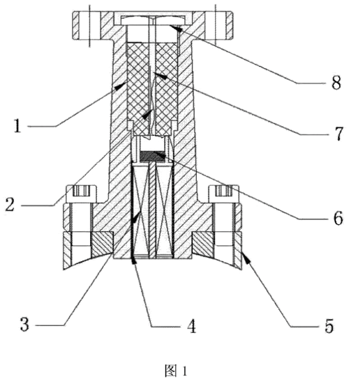 如圖1所示,該傳感器連接桿包括連接桿本體1和連接座5,連接桿本體1經內六角螺栓緊固在連接座5上,傳感器線圈3裝入橡膠防塵套4中后一并裝入連接桿本體1內,利用橡膠防塵套4的伸縮性使傳感器線圈3固定在連接杄本體1內,**磁鋼6安裝在連接桿本體1內位于傳感器線圈3上方,密封圈2裝入連接桿本體1內由六角壓冒8壓實,檢測線7從密封圈2中引出。安裝時,連接座孔與導管上鉆孔對齊,連接座點焊在導管上,連接桿本體與顯示器采用M6內六角螺栓固定。