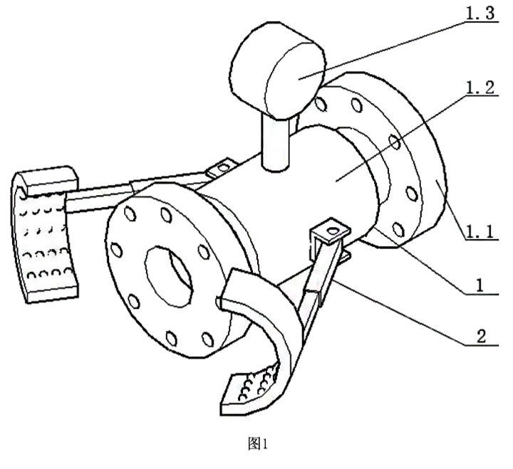 需要說明的是,在不沖突的情況下,本申請中的實施例及實施例中的特征可以相互組合。下面將參考附圖并結(jié)合實施例來詳細說明本申請。如圖1所示,一種便于安裝的電磁流量計,包括電磁流量計主體1,所述電磁流量計主體1包括法蘭盤1.1、測量導(dǎo)管1.2和轉(zhuǎn)換器1.3,所述測量導(dǎo)管1.2為水平橫向放置管道,所述轉(zhuǎn)換器1.3固定在所述測量導(dǎo)管1.2的上端面,兩個所述法蘭盤1.1分別位于所述測量導(dǎo)管1.2的左端面和右端面,還包括定位裝置2,兩個所述定位裝置2分別固定在所述測量導(dǎo)管1.2的前端面和后端面。所述定位裝置2主要用于所述電磁流量計主體1安裝時使用。