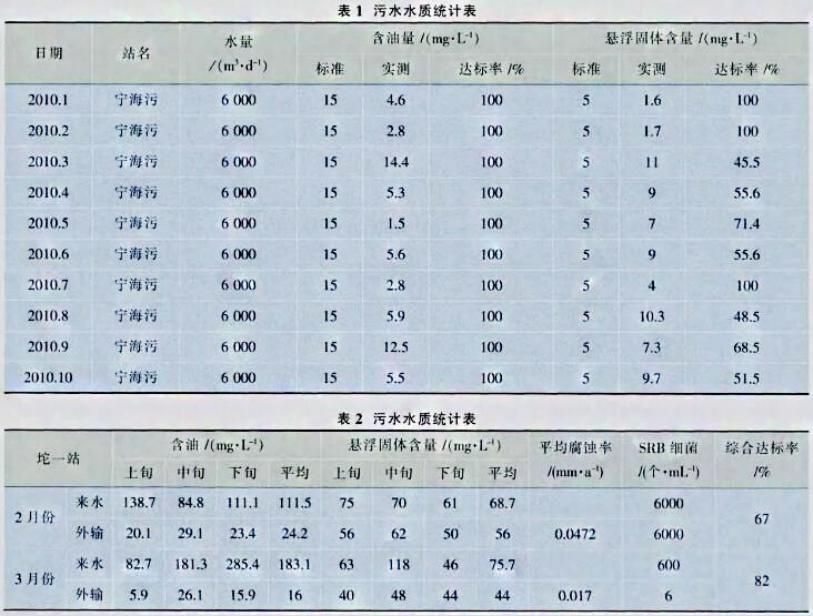 20l1年2月坨一站來水含油平均183.lmg/L外輸含油平均16mg/L,懸浮固體平均8.3mg/L,平均腐蝕率0.017mm/a,SRB細(xì)菌平均6個/ml。只有懸浮固體含量超標(biāo)。