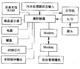 該系統的硬件組成如圖1所示。微控制器采用89C52;探頭選用壓力式探頭,可克服超聲波式探頭易受污水中泡沫干擾的弊病;A/D轉換器選用AD1674;時鐘芯片選用DS1302;液晶顯示器為點陣式的MGLS19264,可顯示四行漢字;非易失性RAM選用DS1230;打印機為普通微型打印機;采樣脈沖輸岀端口用來輸出采樣脈沖,控制采樣器采樣污水;污水處理器狀態輸入端口可輸入污水處理器的通斷時間,供遠程監控作用