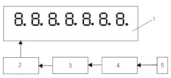 如圖1所示,本實施例所提供的一種用于電磁流量計的遠距離流量顯裝置,包括LED數碼管1和LED驅動芯片2,其特征在于:還包括單片機3、RS485通信芯片4和RS485通信連接件5;