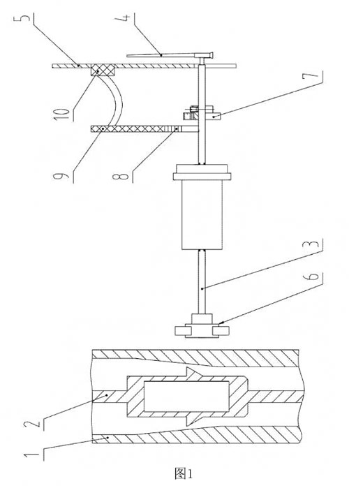 參見圖1、圖2,一種金屬轉子流量計的組合結構,包括測量系統和位移傳感裝置,測量系統包括錐管1和位于錐管1中的磁性浮子2,位移傳感裝置包括指針組件、刻度盤5和轉換器,其中,指針組件包括轉動軸3、感應磁鋼6和指針4,感應磁鋼6固定在轉動軸3的一端,該感應磁鋼6靠近所述磁性浮子2,且感應磁鋼6的磁場方向與磁性浮子2的磁場方向相反,指針4固定在轉動軸3的另一端,其中,磁性浮子2的上端為N極,磁性浮子2的下端為S極,感應磁鋼6的上端為S極,感應磁鋼6的下端為N極。轉換器包括角位移磁鋼7、線性角位移傳感器8、集成電路板9和液晶顯示器10,液晶顯示器10固定安裝在刻度盤5上,角位移磁鋼7呈圓環狀,角位移磁鋼7固定在轉動軸3上,線性角位移傳感器8固定在集成電路板9上,線性角位移傳感器8靠近角位移磁鋼7,集成電路板9與液晶顯示器10之間通過數據線連接。