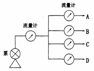 因加工不合格水煤漿的顆粒較大容易堵塞噴槍,小鍋爐大部分采用一臺“螺桿泵”加壓帶一只噴槍,用壓力或流量檢測噴槍堵塞都好解決。但大鍋爐用8~12只噴槍,如圖所示,若A槍半堵塞時,因B、C、D槍在繼續(xù)噴射,壓力變送器則檢測不到A槍是否在正常工作,在此情況下易造成爐膛燃燒點不均勻,影響鍋爐的正常工作。若A槍全堵塞,因B、C、D槍在繼續(xù)噴射,所以A槍壓力的突然變化量很小(壓力信號本身也存在上下的微小波動),DCS很難做出準(zhǔn)確判斷,故用壓力變送器很難達(dá)到預(yù)想的效果。若用流量計檢測,流量計輸出信號送到DCS,利用其編程可以完全檢測到噴槍堵塞狀況并報警提示,以便及時清洗噴嘴。